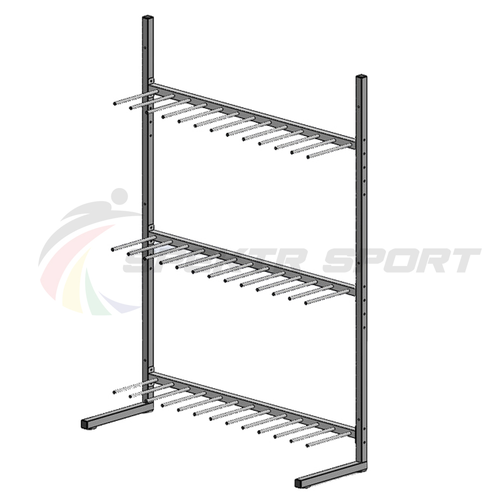Отлично экономит пространство: поставленные в зеркальном положении по отношении друг к другу несколько таких стеллажей уместят достаточное количество лыж, что делает удобным применение стеллажа для прокатов и лыжных баз с ограниченным пространством для хранения инвентаря. Одна стойка может вместить до 39 пар.