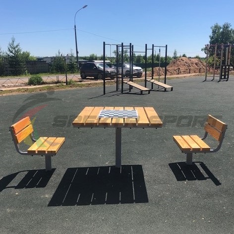 Столешница, сиденья и спинки выполнены из деревянного бруса 100х40, покрытого защитным слоем.